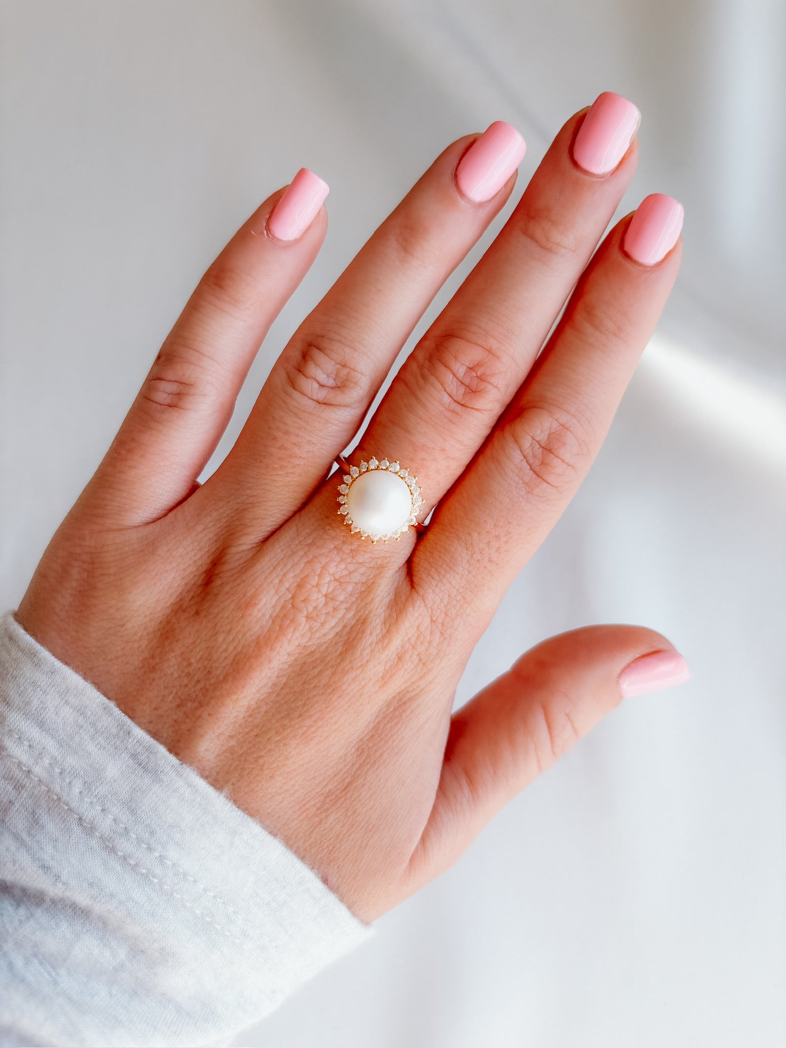 • 14k gold plated freshwater pearl adjustable ring with cz stone halo detail