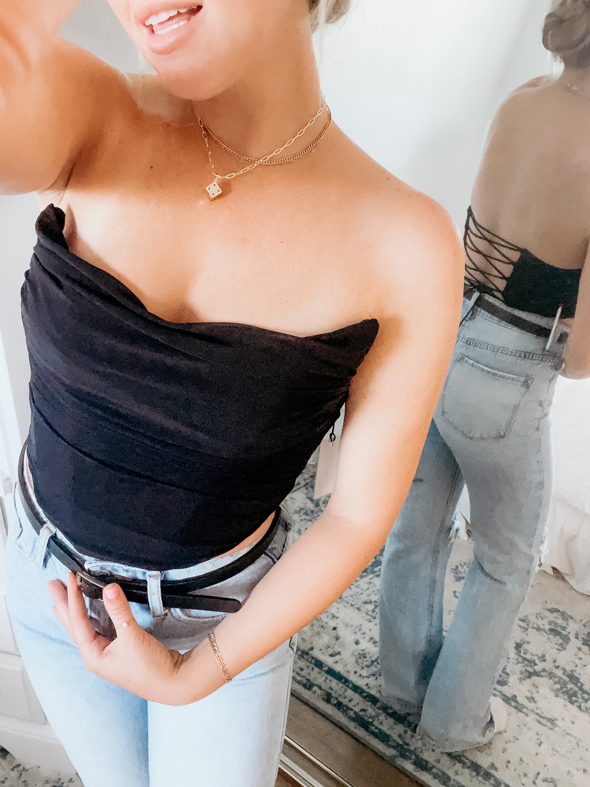 Black strapless sheer corset top with lining at the front for support. Perfect for a nice dinner or a night out!