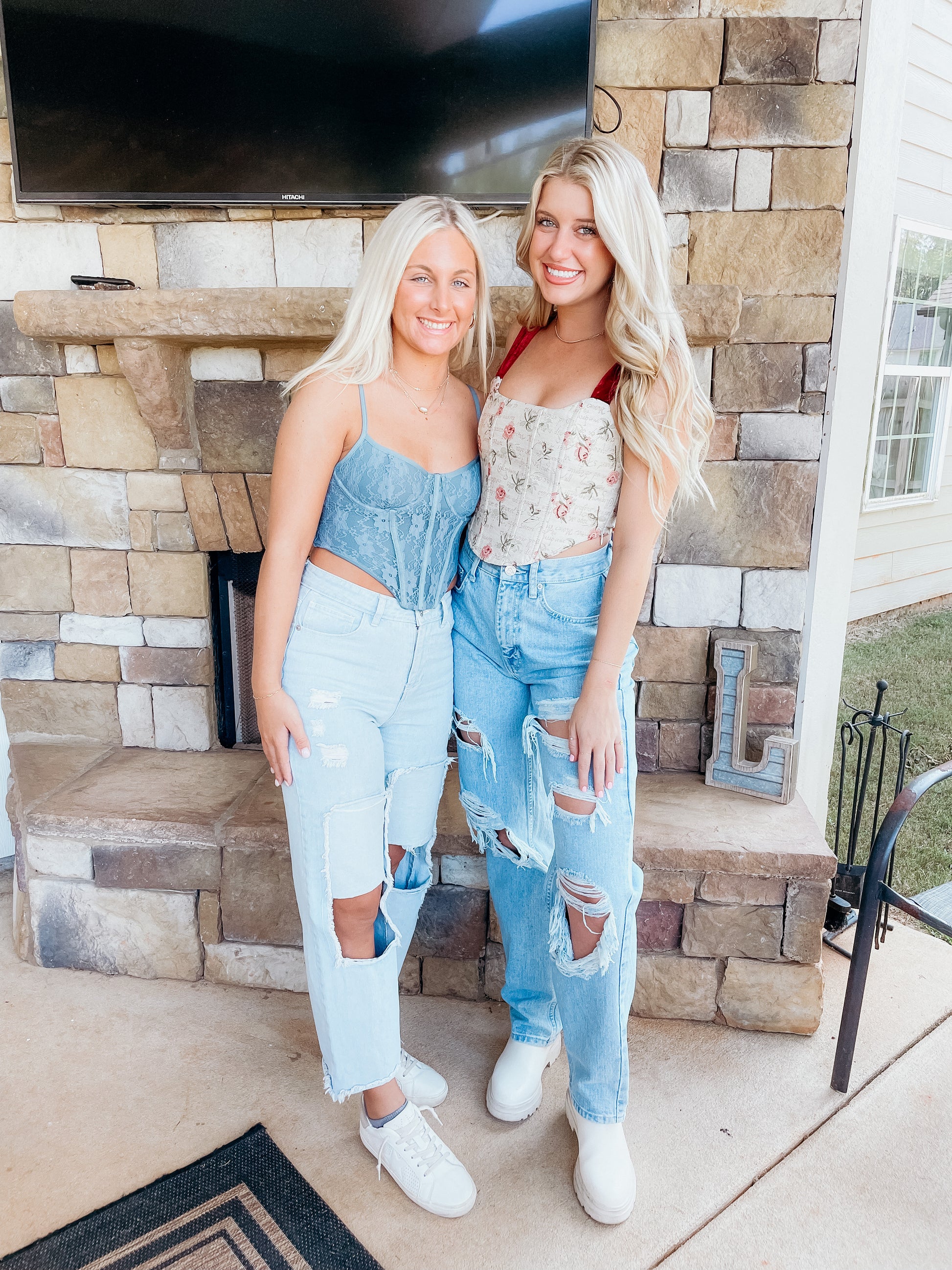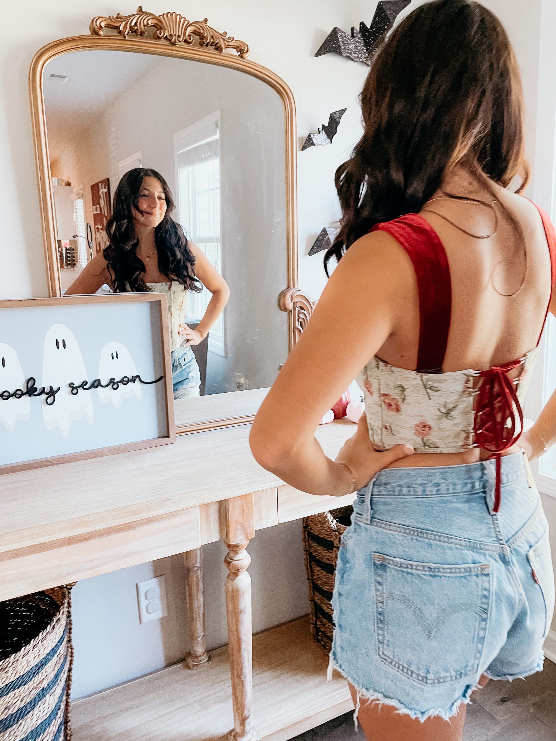 Corset top with red velvet shoulder straps. Has a zipper on the side. Well made and fitting. We’re obsessed with this look!
