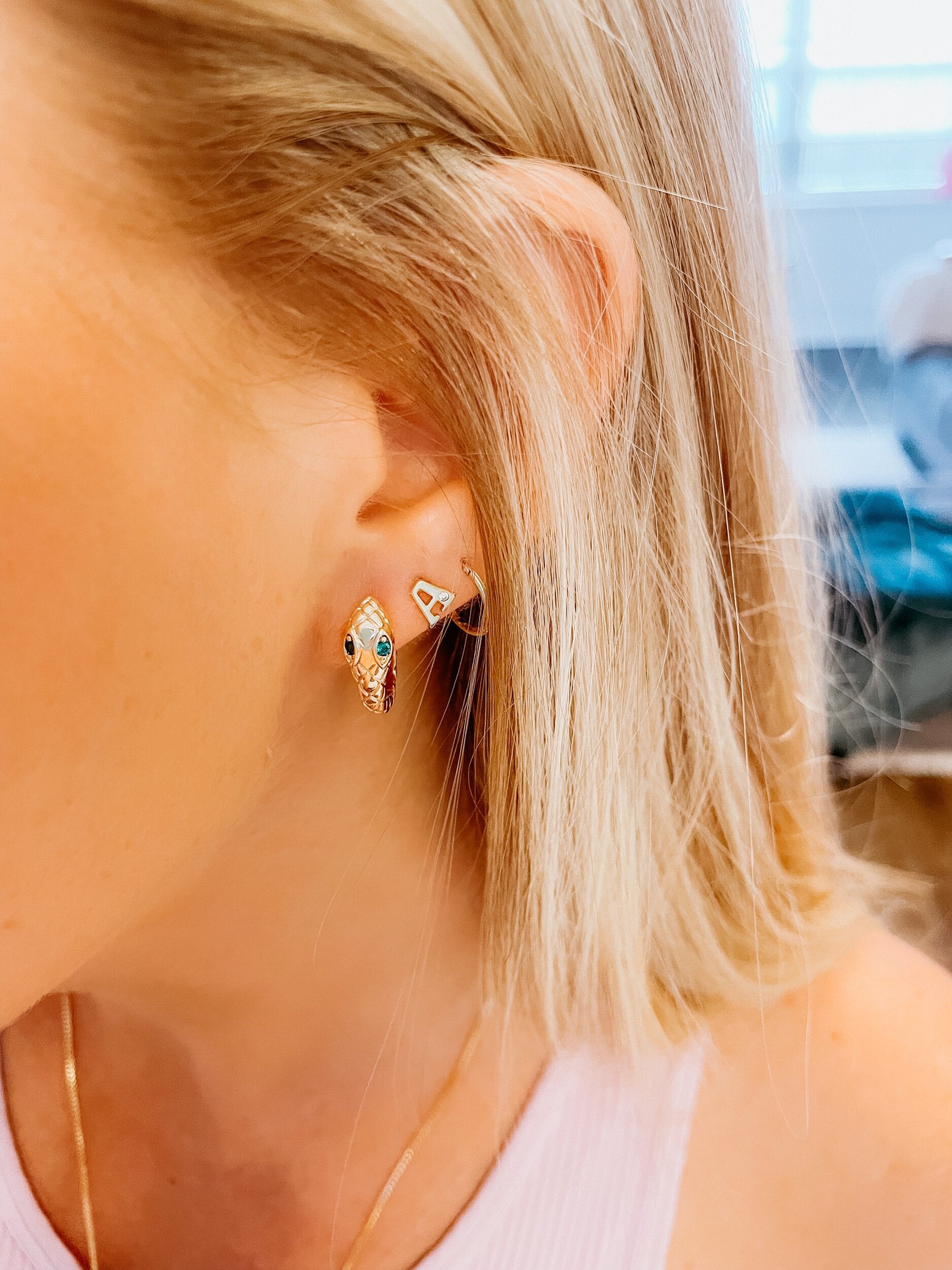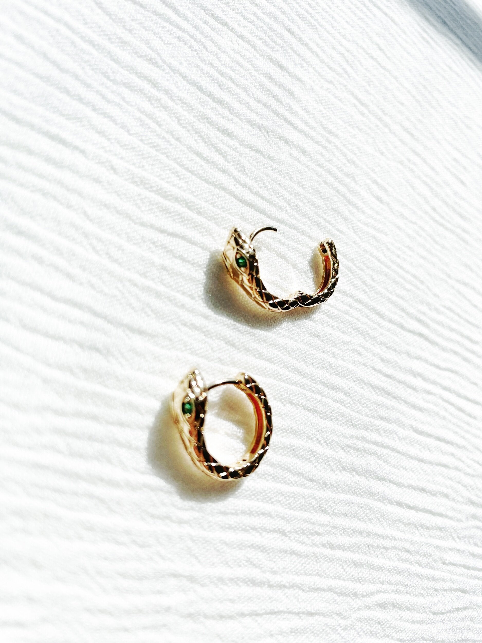 • 14K gold plated snake hugggies with green stone eyes