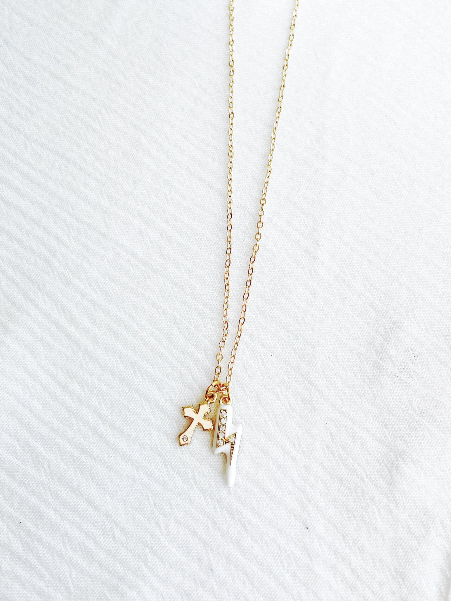 • 14K gold plated chain + cross and lightning bolt charms